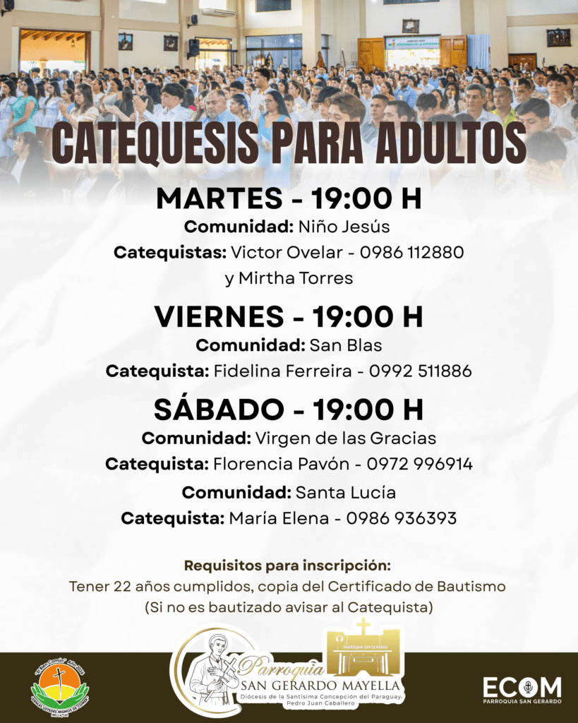 La Parroquia San Gerardo invita a los adultos a participar del proceso de catequesis en sus distintas comunidades, como un camino de formación en la fe y preparación para los sacramentos.
