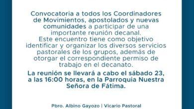La Diócesis de la Santísima Concepción, a través del Vicario Pastoral Pbro. Albino Gayoso, convoca cordialmente a todos los coordinadores…
