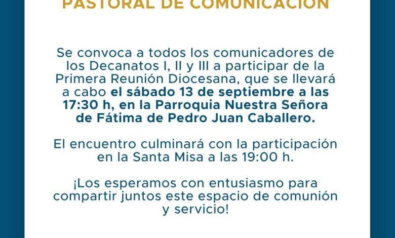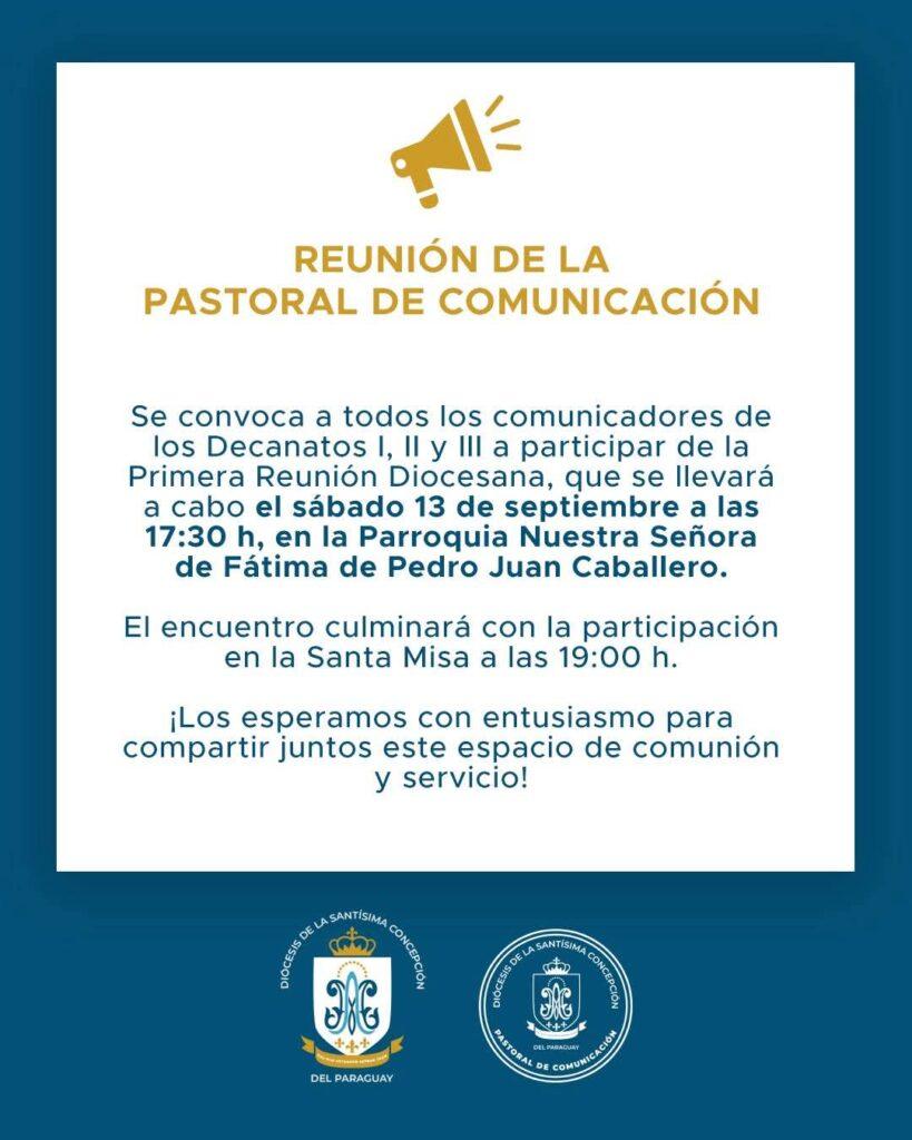 La Diócesis de la Santísima Concepción convoca a todos los comunicadores de los Decanatos I, II y III a participar de la Primera Reunión Diocesana de la Pastoral de Comunicación, que se llevará a cabo el sábado 13 de setiembre a las 17:30 horas, en la Parroquia Nuestra Señora de Fátima de Pedro Juan Caballero.