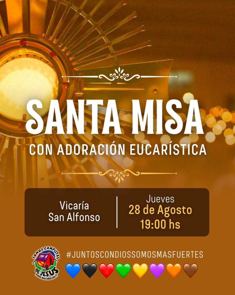 El movimiento Campistas de Jesús invita cordialmente a toda la comunidad a participar de la Santa Misa con Adoración Eucarística, que se celebrará el jueves 28 de agosto a las 19:00 h en la Vicaria San Alfonso. Este encuentro es una oportunidad para profundizar nuestra fe, fortalecer nuestra relación con Dios y vivir un momento de oración profunda junto al Santísimo Sacramento.